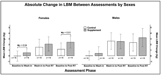 图5. 不同性别去脂体重(kg)的绝对变化(平均值±标准差)。LBM = 去脂体重,RT = 阻力训练;* 表示 p < 0.05。