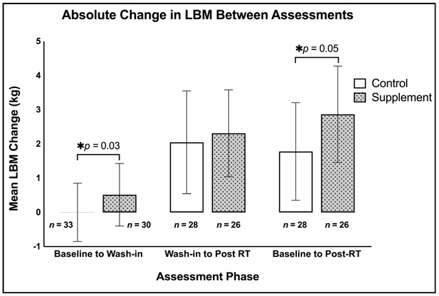 图 4. 瘦体重(kg)的绝对变化(平均值±SD),LBM = 瘦体重,RT = 阻力训练;* 表示 p < 0.05