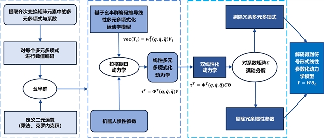 工业机器人线性参数化动力学建模对动力学参数辨识与机器人实时控制具有重要意义。传统的线性参数化模型在描述机器人动力学时,其回归矩阵中存在大量冗余多元多项式项,导致模型计算复杂度高,难以用于实时控制。