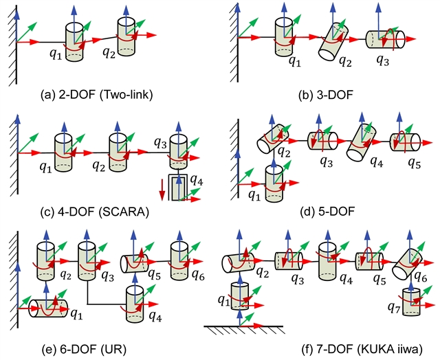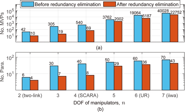 针对这一挑战,中国科学院宁波材料技术与工程研究所精密驱动与智能机器人技术团队提出了一种在编码幺半群中建立机器人动力学计算模型的新方法(图1),提升了线性参数化动力学模型的推导与计算效率。该方法首先证明了链式机构齐次变换矩阵中多项式与运动学参数的线性可分性,并据此推导线性多元多项式化的运动学模型;然后提取多项式的阶数和系数进行数值编码,并定义符合幺半群运算法则的乘法与克罗内克积运算来替代低效的符号运算,推导出线性多元多项式化的动力学模型;接着对得到的惯量参数矩阵进行分解,得到同时为线性参数化和线性多元多项式化形式的双线性化动力学模型;进而通过对双线性化动力学模型中的常系数矩阵进行秩分解,同步消除冗余多项式项和惯性参数。最终,使简化后的编码模型直接解码为Horner形式的符号动力学模型,减少模型多项式中的重复运算,为机器人控制算法的高效部署和计算奠定基础。在六种构型工业机器人(图2)上的实验验证表明,该方法在线性参数化模型推导和高效计算上具有显著优势(图3)。