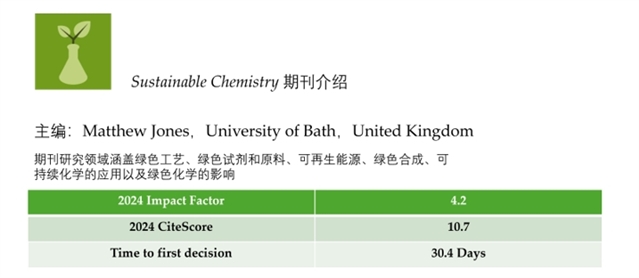 Sustainable Chemistry(ISSN 2673-4079) 是一个国际型开放获取英文学术期刊,旨在为化学工程中可替代的绿色可持续技术提供国际化的学术交流平台。期刊研究领域涵盖绿色工艺、绿色试剂和原料、可再生能源、绿色合成、可持续化学的应用以及绿色化学的影响。其中包括工艺设计、分离纯化技术,绿色溶剂、可再生原料、废物回收利用、二氧化碳的捕获储存,可替代能源、生物质燃料、电池、能源存储、能源效率,有机无机催化合成,仿生和生物传感器的应用、绿色吸附剂、生物质基材料,生命周期评估、污染防治和减少、生态毒理等具体研究问题。我们鼓励科学家尽可能详细地发表实验和理论研究,这些研究既可以是具有学报特色的创造性研究论文,也可以是具有通报特色的综述文章。