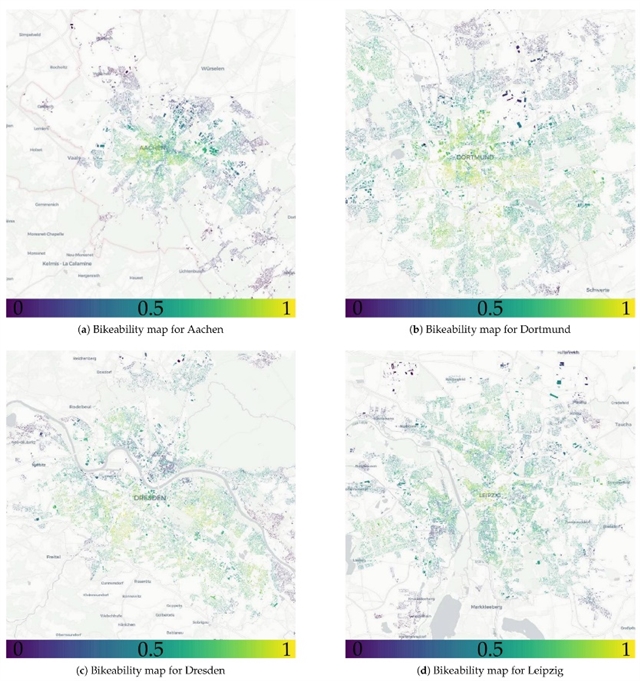 图2 亚琛、多特蒙德、德累斯顿和莱比锡的自行车骑行地图。缩放级别在图3和图3中显示的映射之间是相等的。