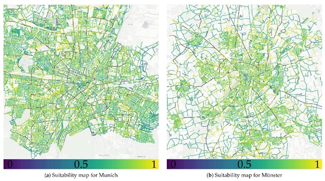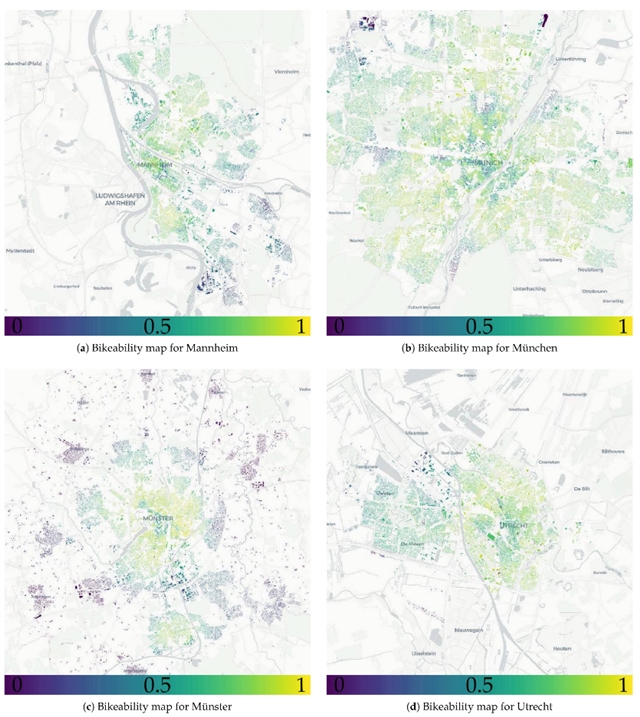 图3 曼海姆、慕尼黑、慕尼黑和乌得勒支的自行车骑行地图。缩放级别在图2和图2中显示的映射之间是相等的。