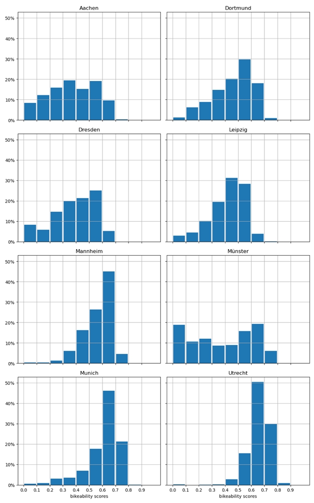 除了平均值、中位数和标准差外,直方图还用于评估城市的可骑自行车性。所有城市的直方图如图4所示。