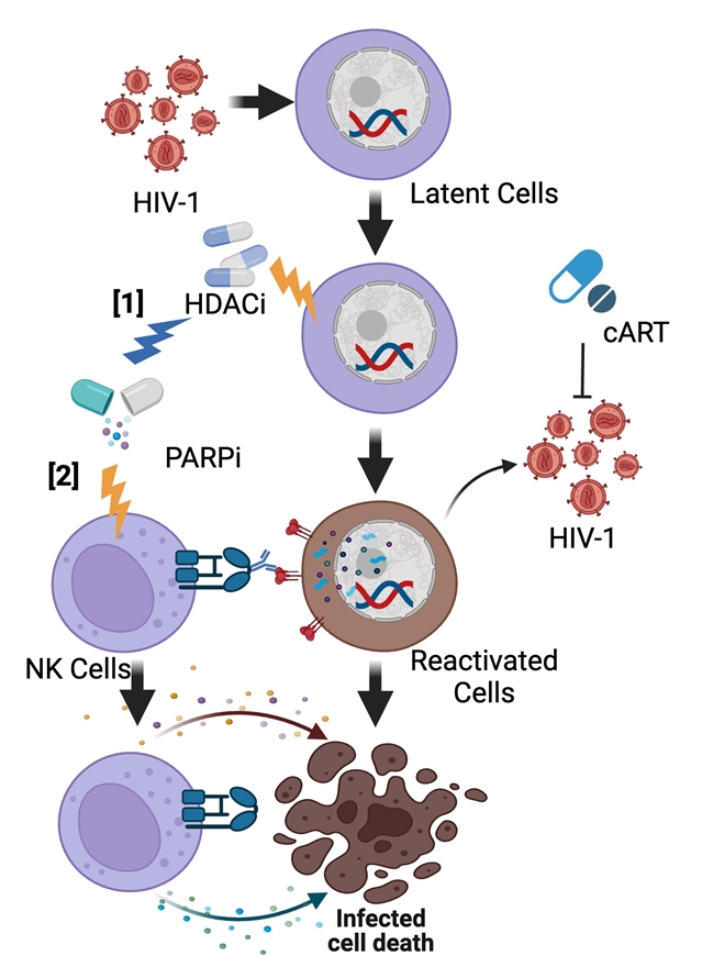 (1) 本研究提出了一种新型组合疗法,将组蛋白去乙酰化酶(HDAC)抑制剂与聚(ADP-核糖)聚合酶(PARP)抑制剂联用,显著增强了潜伏HIV病毒库的激活效果,其协同作用使潜伏逆转效率提高了三倍。