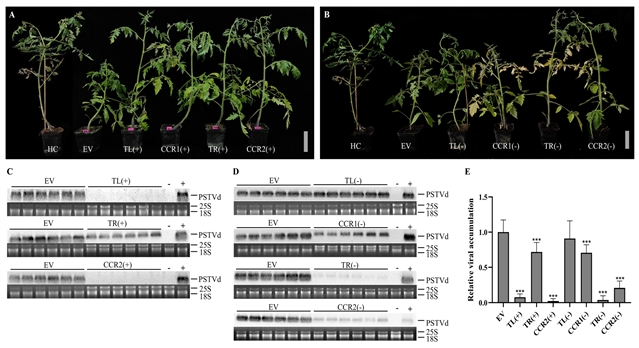 (2) 研究设计并筛选了靶向PSTVd基因组保守区域(如TL、CCR、TR)的crRNAs,发现针对正义链的crRNAs(如CCR2(+))效果尤为显著,为类病毒防控提供了关键分子工具。