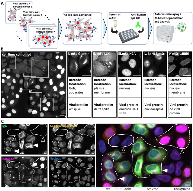 (1) 创新的多重显微检测技术:本研究开发了一种基于亚细胞定位荧光标记(mScarlet)的细胞条形码策略,结合自动化高分辨率显微镜和机器学习分析,实现了对多种病毒抗原(如SARS-CoV-2不同变异株的刺突蛋白和核衣壳蛋白)抗体结合的同步检测。该方法仅需单一荧光通道即可区分多达8种不同细胞系,显著提升了检测通量和效率。
