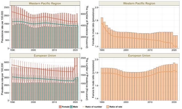 图1. 1990–2021年西太平洋与欧盟青少年抑郁患病率的性别差异对比趋势