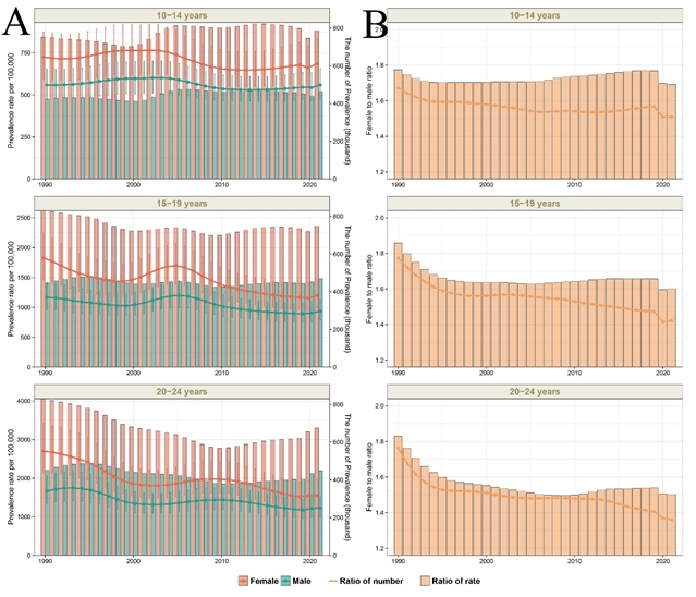 1990至2021年,西太平洋地区青少年抑郁负担的性别差距持续缩小,女性与男性的DALYs比值从1.84降至1.58。性别差异随年龄增长而减弱,10–14岁组最为显著。各国差异不一,澳大利亚、新西兰和中国的性别差距最大;文莱、日本、新加坡和韩国则在20–24岁人群中差异更明显。