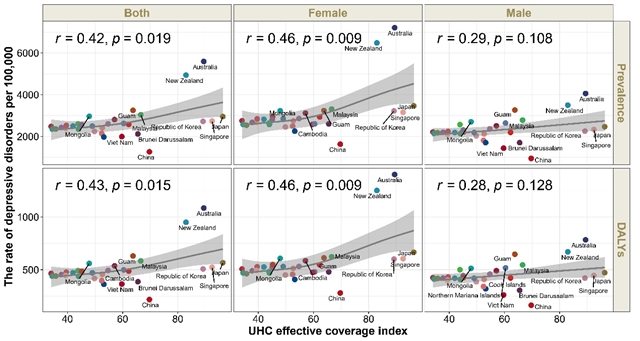 图3. 2021年西太平洋地区10–24岁青少年和年轻人中抑郁障碍负担率与UHC有效覆盖指数之间的关联
