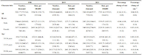 表1. 1990年至2021年西太平洋地区10–24岁青少年和年轻人中抑郁障碍的患病人数、患病率及患病率变化百分比