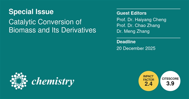 Chemistry邀请了中国科学院长春应用化学研究所程海洋研究员,东北师范大学张弨教授和郑州大学张萌博士,合作创建特刊Catalytic Conversion of Biomass and Its Derivatives(生物质及其衍生物的催化转化)。本特刊重点关注通过非均相和均相催化剂的使用,完成生物质及其衍生物的高效催化转化过程,包括但不限于以下主题: