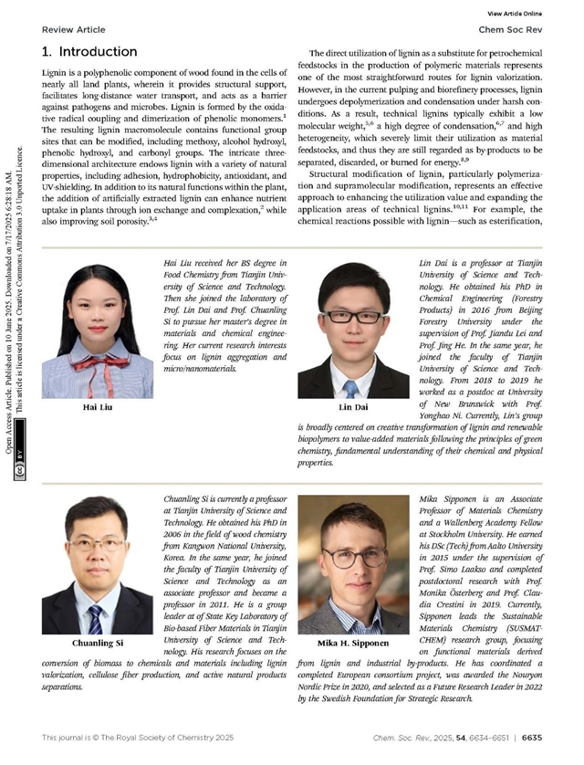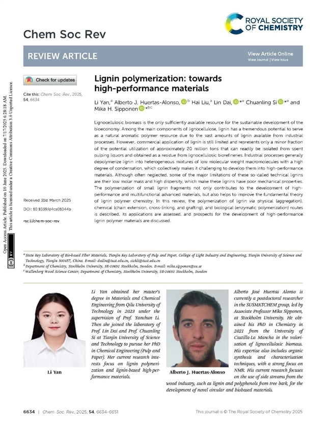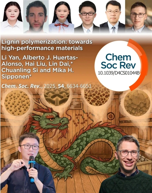 近日,天津科技大学戴林/司传领团队联合瑞典斯德哥尔摩大学 Mika H. Sipponen 团队提出了一种颠覆性的观点,即通过提高木质素的分子量解决工业木质素分子量小等问题,完善木质素高分子化学基本理论,拓展木质素在先进复合材料领域的规模化、高值化应用。该工作以题为“Lignin polymerization: towards high-performance materials”发表在《Chemical Society Reviews》2025年7月第54卷14期,并被遴选为正封面文章(Front cover)。天津科技大学博士研究生闫莉为第一作者,天津科技大学戴林/司传领、斯德哥尔摩大学Mika H. Sipponen为共同通讯作者,天津科技大学为第一单位,欢迎下滑阅读了解更多