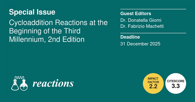 Reactions邀请了佛罗伦萨大学 (University of Florenc) Donatella Giomi博士和Fabrizio Machetti博士,合作建设特刊Cycloaddition Reactions at the Beginning of the Third Millennium, 2nd Edition (新千年初的环加成反应研究(第二版))。本期特刊旨在汇集关于[4+2]环加成反应(包括Diels-Alder反应、杂Diels-Alder反应和1,3-偶极环加成反应)以及[2+2]环加成反应的最新应用研究成果,重点关注合成方法学成果、反应机理及理论研究成果。