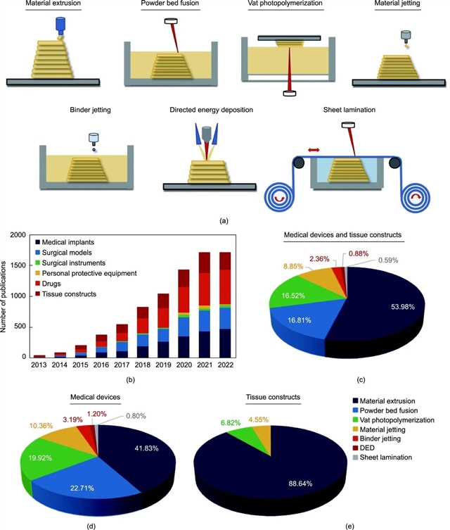 图1 (a)7种不同类型的3D打印技术——材料挤出成型、材料喷射成型、粉末床熔融成型、立体光固化成型、黏结剂喷射成型、直接能量沉积成型和薄片层压成型。(b)过去十年中,3D打印医疗器械和组织结构出版物的数量。制造医疗器械和组织结构(c)、医疗器械(d)、组织结构(e)所使用的3D打印技术的分析。