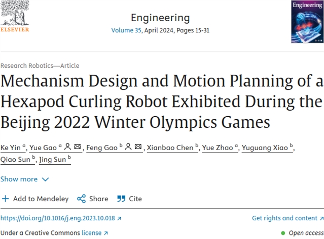 在 2022 年北京冬奥会上,上海交通大学高岳副教授(电子信息与电气工程学院)与高峰教授(机械系统与振动全国重点实验室)团队研发的六足冰壶机器人备受瞩目。这款融合仿生机械设计与智能控制技术的 “冰上选手”,其核心成果以“Mechanism Design and Motion Planning of a Hexapod Curling Robot Exhibited During the Beijing 2022 Winter Olympics Games”(北京 2022 年冬奥会六足冰壶机器人的机构设计与运动规划)为题,发表于中国工程院院刊《Engineering》,深度解析了机器人技术在冬季运动中的创新实践。