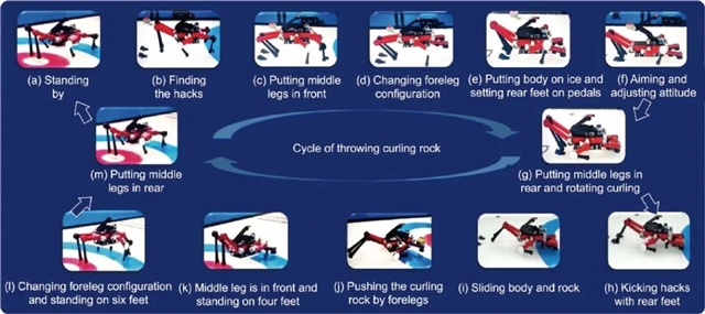 图2. 投掷冰壶循环:机器人在六足状态下寻找起滑架,在四足状态下投掷冰壶。