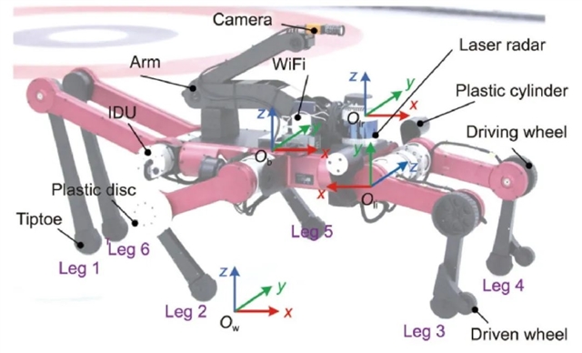 这款六足冰壶机器人重 75 公斤,体长 0.6 米,采用独特的腿部模块化设计,可实现行走与投掷两种模式的平滑切换。其前腿和中间腿小腿长度为 0.3 米,后腿延长至 0.5 米以增强踢击动能,21 个电机分布于髋部、膝盖和身体,分别驱动腿部运动、冰壶旋转和机械臂动作。
