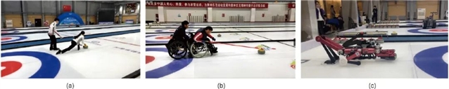 图3. 冰壶投掷场景?(a)两名健全运动员正在投掷,其中一名运动员与冰壶一起滑动,另一名运动员则准备用冰刷清扫冰面;(b)两名轮椅运动员 正在投掷,其中一名运动员用细杆推动冰壶,另一名运动员则瞄准目标;(c)六足冰壶机器人准备投掷。