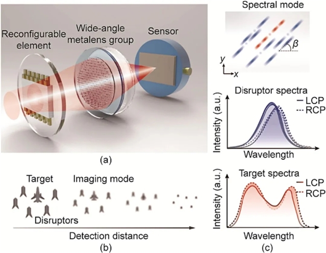 图1 基于电控可调超构表面的可重构双模探测概念演示。(a)共口径超构表面光学系统的示意图,其中电控可重构元件可以实现大视场成像和光谱探测模式之间的切换;(b)干扰物和目标的成像结果,在远距离探测时显示出相似性和不可识别性;(c)干扰物和目标的光谱图案和偏振辐射光谱,具有显著的区别。LCP:左旋圆极化;RCP:右旋圆极化;β:光谱分裂方向。