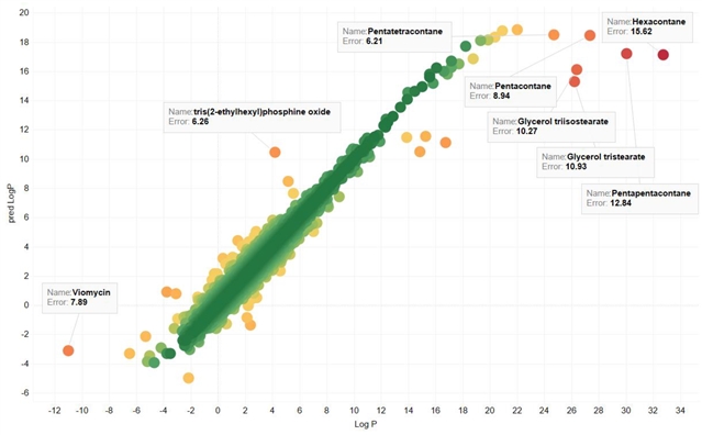 图例:使用正辛醇的溶剂参数计算的对数P值(N = 6852),比较测量值与预测值的Abraham溶质描述符。数据点按绝对误差着色。