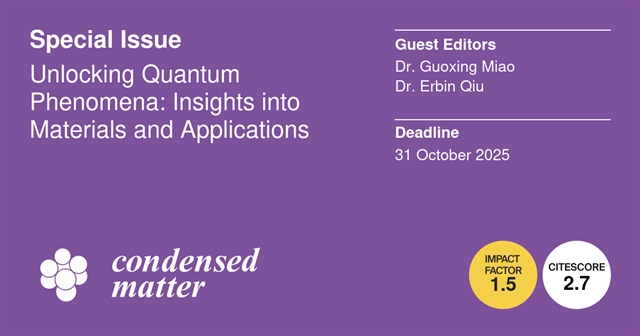 Condensed Matter邀请了加拿大滑铁卢大学苗国兴博士和加州大学圣地亚哥分校邱二斌博士,合作建设特刊Unlocking Quantum Phenomena: Insights into Materials and Applications (解锁量子现象:凝聚态材料与应用新视角)。本特刊重点关注在量子材料中电子、磁性与结构特性之间的关系,特刊包括但不限于以下主题: