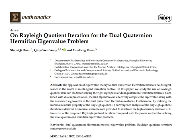 上海大学数学系王卿文老师及研究团队文章:对偶四元数厄密特征值问题的瑞利商迭代|Mathematics文章推荐 |