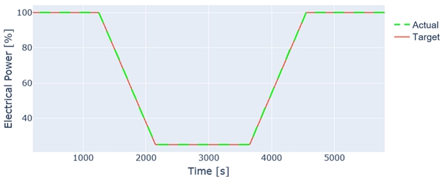 PB-HYGR负荷跟踪工况下电功率输出对比(红线为目标值,绿线为实际输出)