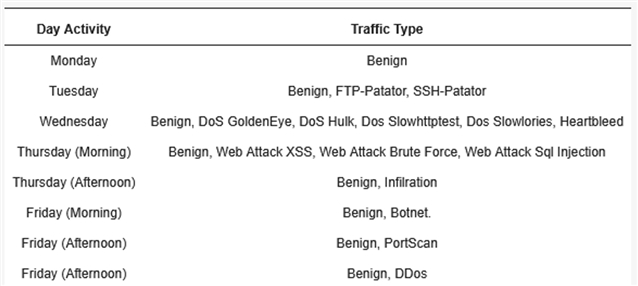 新不伦瑞克大学的加拿大网络安全IDS研究所创建了本研究中使用的CICIDS2017数据集。该数据集是常用的,包括良性和最近流行的网络攻击,使其成为网络安全研究人员b[37]的重要资源。该数据集通常用于创建和评估入侵检测系统,以及检查网络安全和异常检测。CICIDS2017数据集由八个独立的文件组成,每个文件都包括正常和恶意流量数据。这些文件记录了五天的网络活动。表1表示每个文件的日活动和流量类型。图1描述了预处理步骤后使用的数据集的良性和恶意流量的分布。