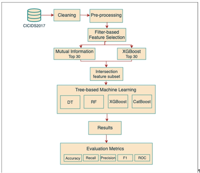 基于树的机器学习分类:本文作者使用众所周知的树分类器,如DT、RF、XGBoost和CatBoost,将网络数据分为良性和恶意。这些分类器是基于它们在处理网络流量中的复杂和非线性模式方面的鲁棒性以及它们在处理大量数据时的效率而为本文作者的模型选择的。通过利用数据的不同方面,每个分类器增强了入侵检测系统的整体检测能力,提高了入侵检测的精度和可靠性。然后,本文作者使用评估指标来评估所提出的方法的性能。通过关注最相关的特性和使用强大的分类器,本文作者的模型解决了IoMT环境中的关键安全挑战。图2演示了所建议模型的流程。