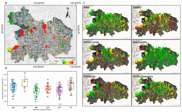 研究发现,北京市中心城区绿地公园的暴露水平呈现显著的空间差异 (图3),从中心向外呈梯度式下降趋势。具有历史功能的公园暴露度总体高于其他类型的公园,而社区和休闲公园的暴露水平相对较低。此外,研究区北部和西北部的公园绿地质量较高,而中心城区的公园则在可达性和访问频率上具有更大优势,体现了不同区域公园功能与服务特征的差异性。