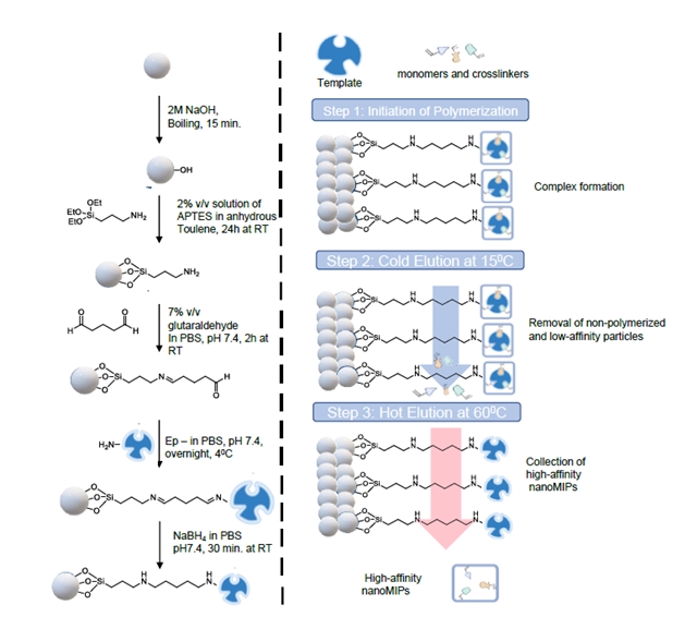 图1 表位模板固定在玻璃珠上作为固体载体(左)和三步固相合成(右)的示意图。
