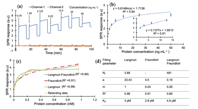 图2 (a)累积cTnI检测的实时SPR传感器图。(b)浓度依赖性蛋白结合,在线性范围内相关系数为0.94,R2值为0.911.56-12.5 ng mL-1。(c)纳米omip与cTnI相互作用的结合等温线拟合。(d)由Langmuir, Freundlich和Langmuir -得到的结合等温线拟合参数弗伦德里希模型。