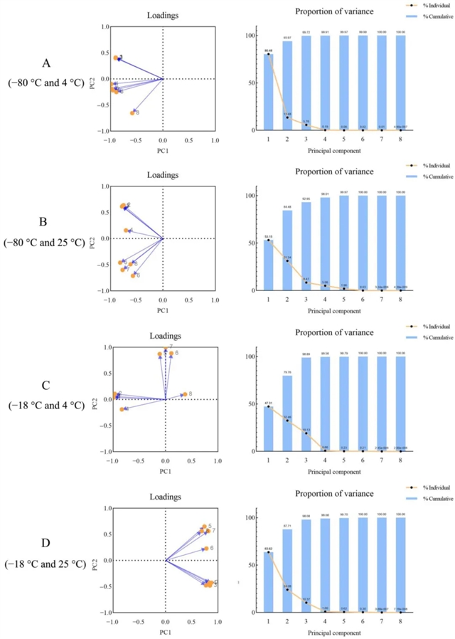 图为不同贮藏及解冻温度下芹菜冻品色素降解的主成分分析。