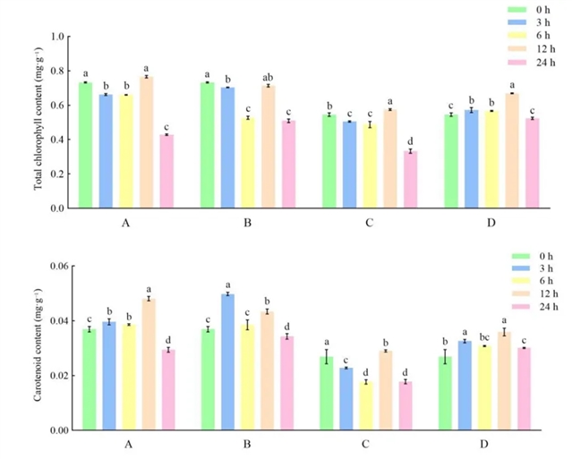 图为不同冻融温度对芹菜叶片解冻过程中总叶绿素 (上图) 及总类胡萝卜素 (下图) 吸光含量的影响。