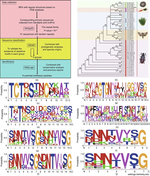 图1. 抗冻肽的设计。(a)设计新型抗冻肽的流程图;(b)通过ML分析获得的来自9种耐寒生物的IBP的系统发育树;(c)~(j)对重复氨基酸序列 的基序进行保守分析。