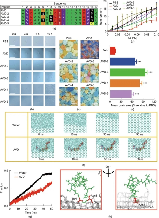为进一步探究 AVD 的抗冻机制,科研人员通过定点突变和分子动力学模拟(MD)进行研究。结果表明,AVD 肽的 Thr6 和 Asn8 残基是其冰结合能力的关键位点,而 Ser18 残基可协同增强它们与冰的相互作用,共同阻碍冰的生长。