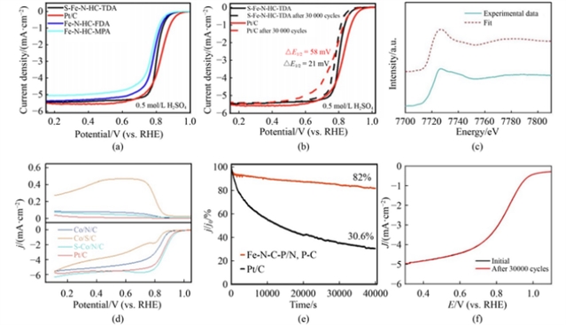 杂原子掺杂可通过长程或直接配位效应调节M-Nx位点的电子结构。例如,S掺杂的Fe-N-HC催化剂(S-Fe-N-HC TDA)在0.5 mol/L H2SO4中半波电位(E1/2)为0.80 V,循环30000次后仅衰减21 mV,稳定性显著优于商用Pt/C。理论计算表明,掺杂原子与活性位点的距离直接影响ORR过电势,硫原子在特定位置(S1)可使过电势降至0.563 V。