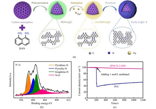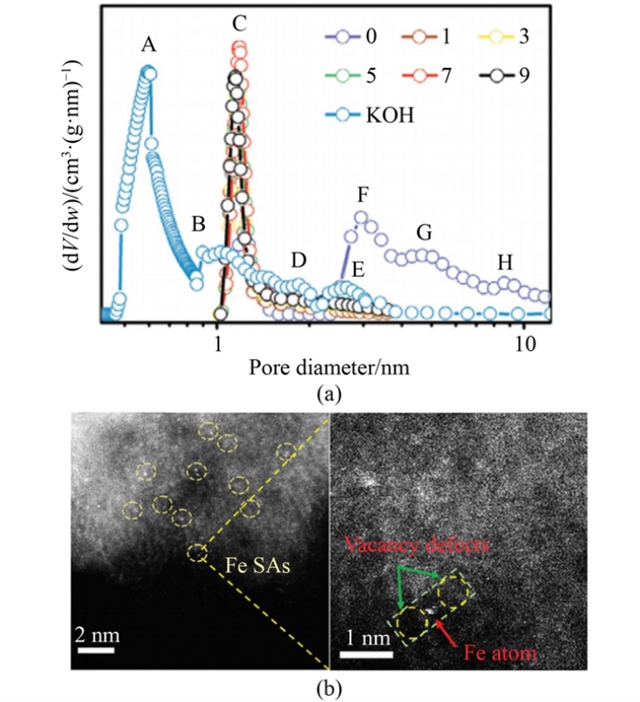 空间限域效应则通过纳米级空间限制金属原子迁移。例如,ZIF-8封装Fe(acac)3前驱体,高温热解后可形成均匀分散的Fe-N4位点。此外,多孔结构设计与二次掺杂可进一步提升位点的暴露与负载量,例如Fe-N-C-meso-evap催化剂通过硫酸诱导介孔结构,显著增强了Fe-Nx位点的稳定性与可及性。