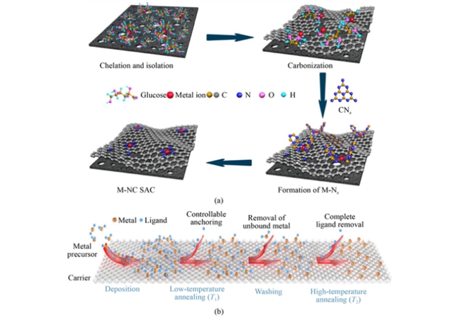 增加活性位点密度需要抑制金属原子团聚并增强其与载体的结合。其中,螯合策略通过强配位(如吡啶氮、氨基)固定金属离子,例如,以PDANFe(III)为前驱体合成的Fe-N-C催化剂,因均匀分散的FeNx位点展现出高ORR活性。缺陷捕获利用碳基质缺陷锚定金属原子,Cu-SACs催化剂经缺陷工程后,显著提升了位点可及性。级联锚定策略通过多步锚定与隔离层保护,可制备出负载量高达23 wt%的超高密度单原子催化剂。