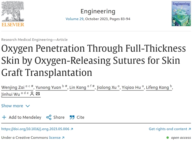 Wenjing Zai, Yunong Yuan, Lin Kang, Jialong Xu, Yiqiao Hu, Lifeng Kang, Jinhui Wu. Oxygen Penetration Through Full-Thickness Skin by Oxygen-Releasing Sutures for Skin Graft Transplantation. Engineering, 2023, 29(10): 83–94.