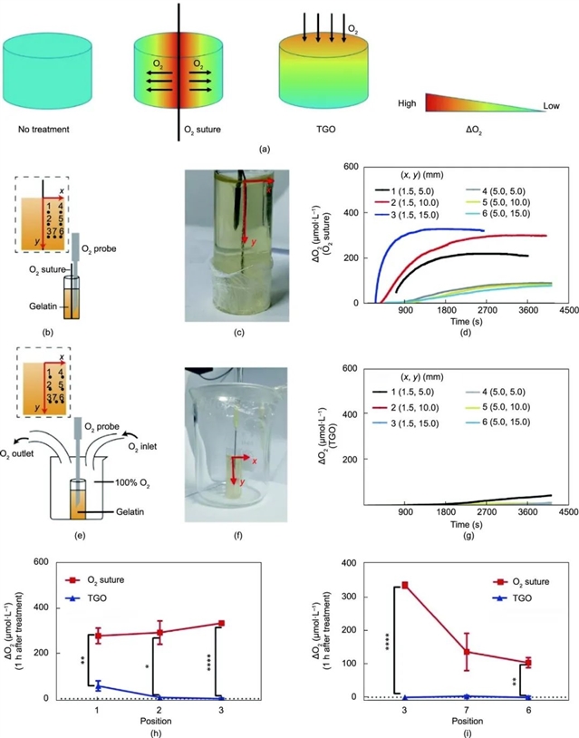 图2. 产氧缝合线与局部气态氧疗的氧气渗透效率比较。(a)通过明胶水凝胶中的产氧缝合线或局部气态氧疗(topical gaseous oxygen therapy, TGO 疗法)推测氧气渗透性的示意图。(b)通过产氧缝合线疗法监测氧气扩散的装置示意图。氧气微电极插入明胶水凝胶的不同位置,缝合线插入明胶水凝胶的中心。明胶水凝胶中的不同位置(1、2、3、4、5、6、7)用 x 和 y 来定义,其中,x 代表与产氧缝合线的水平距离,y 代表与明胶水凝胶表面的垂直距离。(c)监测氧气通过产氧缝合线扩散的装置图像。(d)产氧缝合线疗法在明胶水凝胶不同位置的氧气浓度曲线。(e)通过 TGO 疗法监测氧气扩散的装置示意图。明胶水凝胶被置于持续充满氧气的容器中。(f)通过 TGO 疗法监测氧气扩散的装置图像。(g)在明胶水凝胶的不同位置进行 TGO 疗法的氧气浓度曲线。(h)明胶水凝胶不同深度的氧气浓度变化(ΔO2),治疗后 1 h 的 x 值相同。(i)治疗后 1 h,明胶水凝胶不同宽度处氧气浓度的变化(ΔO2),y 值相同。(h)和(i)中的 n = 3。