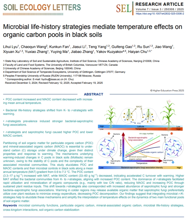 论文标题:Microbial life-history strategies mediate temperature effects on organic carbon pools in black soils