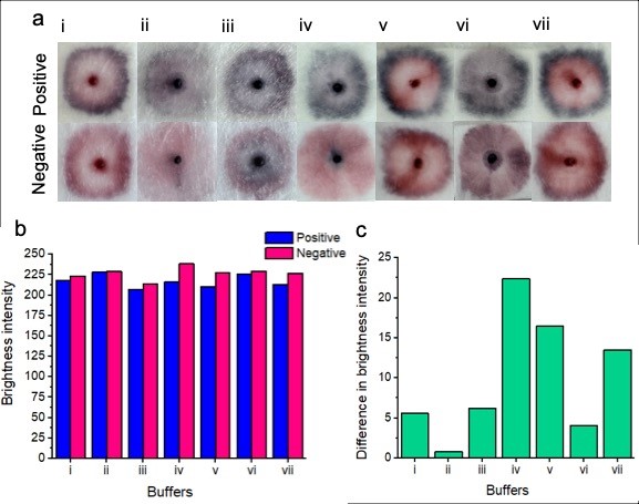 图3中,(a) 从左到右分别是SDS缓冲液,sodium borate/sucrose/NaCl/Tween/Sodium azide缓冲液,tris-HCl/MgCl2/NaCl and ethanol缓冲液,sodium borate/KCl/Tween缓冲液,phosphate缓冲液,Tris-HCL 缓冲液,HEPES 缓冲液。(b) 显示所有缓冲液在阳性测试中显示的红色通道亮度强度都较低。缓冲液 (iv) 在阳性和阴性结果之间显示的红色通道亮度强度差异最大,后续实验选择sodium borate/KCl/Tween缓冲液,其能以肉眼明显区分阳性样本和阴性样本。