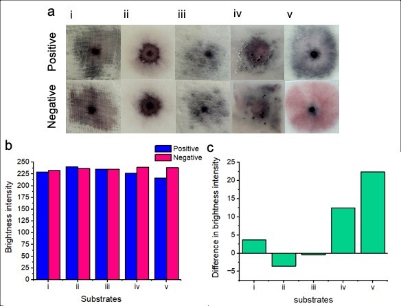 图 b 表示每个实验三次重复实验的平均值,在红色通道亮度强度方面,阳性“蓝色”测试与空白“粉红色”阴性测试有显著差异。灰霉病、葡聚糖和淀粉与空白样品的红色通道亮度强度差异都很小。