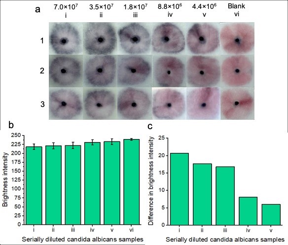 图5中,(a) i-v分别是五中不同浓度的白色念珠菌细胞阴道液模拟溶液,并与空白溶液 (vi) 进行比较。结果在20分钟后显示。(b) 显示在对每个浓度和重复实验进行图像处理后,随着白色念珠菌真菌细胞浓度的降低,由于纳米颗粒聚集的减少,红色通道亮度强度增加。(c) 显示了与空白测试相比每个浓度的红色通道亮度强度的差异。白色念珠菌细胞浓度越高,红色通道亮度强度与空白溶液的差异越大。图 5c 的结果代表图 5b 中每个单独浓度的平均值。
