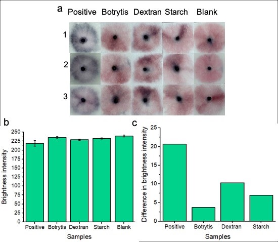 结合作者之前的研究,使用其他可用的含葡聚糖物质——100 μL相应的溶液(含淀粉、葡聚糖或灰霉病)。进行了三次单独的重复实验(1、2 和 3)。图a结果显示在 20 分钟的显影时间后,每种含非特定葡聚糖的物种与空白样品相比都显示出相似的“粉红色”结果。