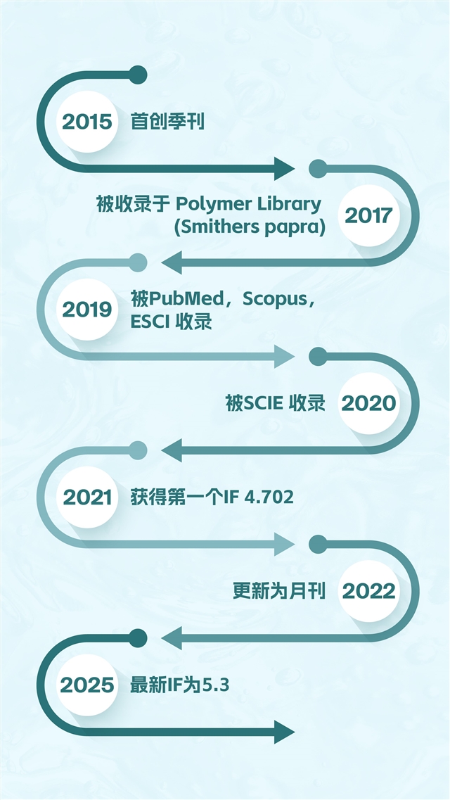 2025年,Gels期刊迎来了具有里程碑意义的创刊十周年。在这十年间,期刊取得了令人瞩目的学术成就:先后被PubMed、Scopus、SCIE (Web of Science) 等国际权威数据库收录,学术影响力持续提升。根据科睿唯安 (Clarivate Analysis) 2025年6月18日发布的Journal Citation Report最新数据显示,Gels期刊影响因子到达了5.3,创历史新高,在"Polymer Science" (高分子科学) 领域稳居Q1 (14/94);同时,截至今年期刊Citescore指数也攀升至7.6,在“Organic Chemistry” (有机化学) 和“Polymers and Plastics” (聚合物和塑料) 领域跻身Q1,这标志着期刊学术质量与影响力的全面提升。