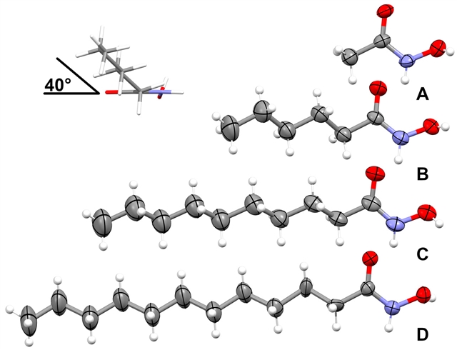 摘要:利用单晶衍射技术揭示了四种异羟肟酸 (HA) 的结构,这些HA与多种金属形成复合物并表现出抗真菌活性。文中报道了碳链长度为C2、C6、C10和C12的HA的结构。该系列中链长最小的成员N-羟基乙酰胺 (HA2) 结晶于中心对称空间群P21/c,而链长较长的成员N-羟基己酰胺 (HA6)、N-羟基癸酰胺 (HA10) 和N-羟基十二酰胺 (HA12) 结晶于空间群P21,并表现出显著的堆积特性。
