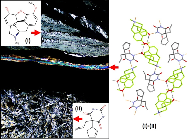 摘要:采用研磨技术和从醇溶液中蒸发的方法制备了由可待因和环戊巴比妥形成的双组分化合物。通过单晶X射线结构测定,明确确定了该相的共晶性质。不对称单元包含一个分子式单元。在环戊巴比妥分子中,环戊烯基环在两个位置上处于无序状态,这两个位置通过其与嘧啶环的C—C键旋转约180°而相互关联。环戊巴比妥分子的两个NH基团分别与不同可待因分子的哌啶和羟基形成N—H…N键和N—H…O键。此外,相邻可待因分子的羟基和甲氧基通过O—H…O相互作用连接,从而形成可待因和环戊巴比妥分子的氢键骨架结构。该共晶还利用热分析、X射线粉末衍射和红外光谱进行了表征。